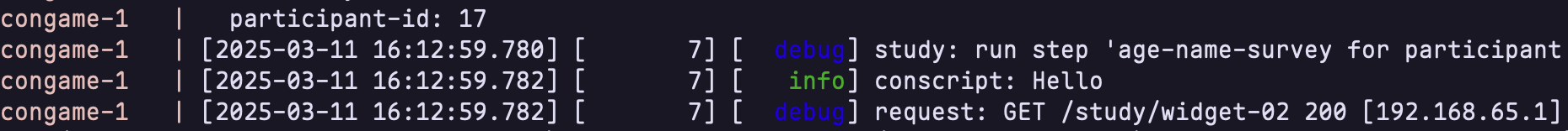 (defstep (age-name-survey) @md{ # Survey @form{ What is your first name? @(set! first-name (input-text)) @(begin (log-conscript-info "Hello") "") @submit-button }})