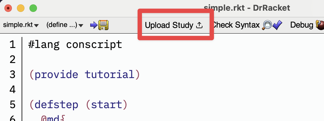 In DrRacket, save the study you created above as "simple.rkt".