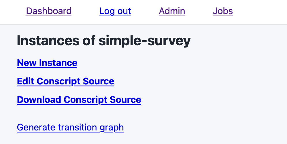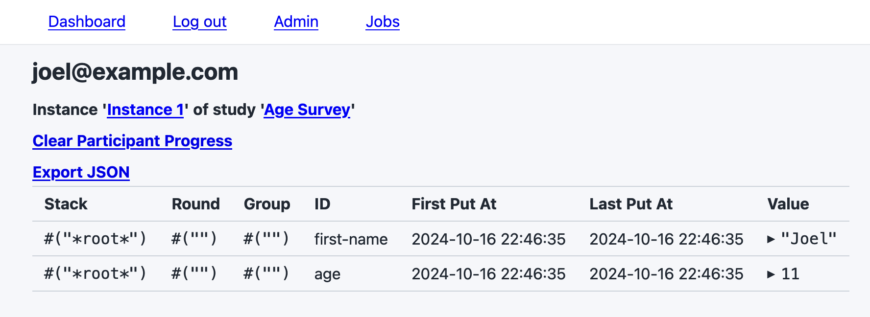 Once you’re done with the study, navigate back to the dashboard. Then click on the Admin → simple-survey (in the list of studies), then on the Age Instance 1 link.